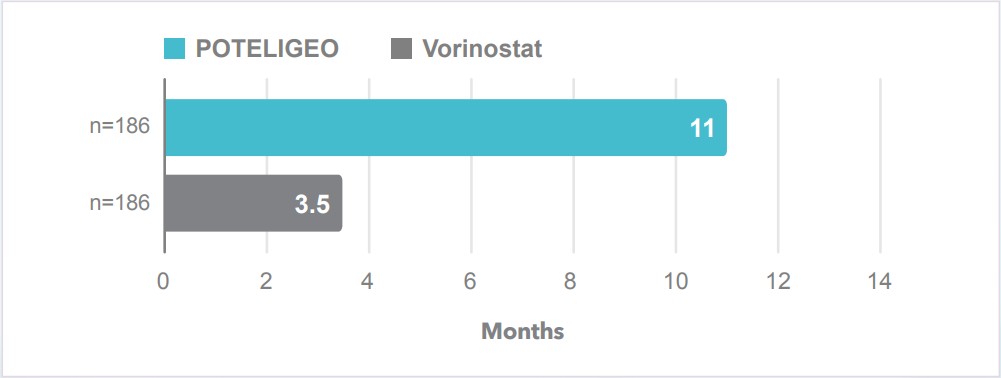 - POTELIGEO also demonstrated longer TTNT vs vorinostat across blood classifications25